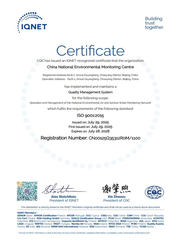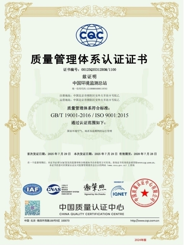 2025年7月29日,中國環(huán)境監(jiān)測總站(以下簡稱總站)建設(shè)、運(yùn)行的國家環(huán)境空氣、地表水監(jiān)測網(wǎng)質(zhì)量管理體系,順利通過中國質(zhì)量認(rèn)證中心(以下簡稱CQC)審核并獲頒ISO 9001認(rèn)證證書。